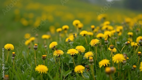 Fototapeta premium Vibrant Yellow Dandelion Field on a Lush Green Hillside, A Breathtaking...