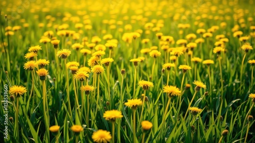 © sasiprapa, Fototapeta premium Vibrant Yellow Dandelions Blooming in a Lush Green Meadow at Sunset