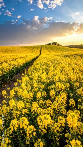 Obraz premium Vibrant Yellow Flower Field Under a Gorgeous Sky at Sunset