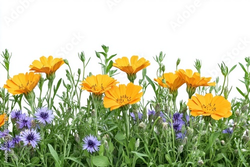 © wannathon, Fototapeta premium Vibrant Yellow Flowers and Blue Wildflowers Growing Together Against a Clean White Background, Perfect for Natural Beauty or Floral-Themed Projects