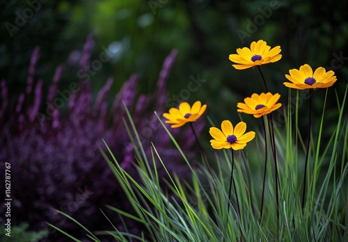 © Abdul, Fototapeta premium Vibrant Yellow Flowers in Lush Green Grass