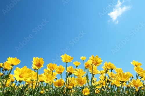 Naklejka premium Vibrant Yellow Flowers Under a Sunny Sky: A Breathtaking Spring Meadow