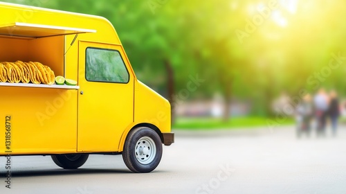 © Sasiwan, Obraz premium vibrant yellow food truck is parked in sunny park, serving delicious tacos with fresh ingredients. background is blurred, highlighting truck and its offerings