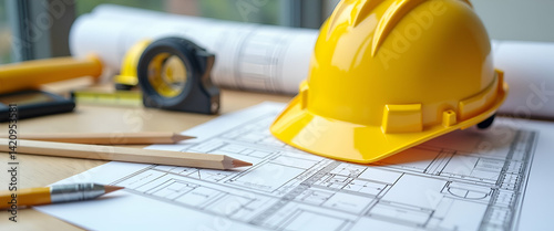 © Netaya, Fototapeta premium Vibrant Yellow Hard Safety Helmet with Architectural Blueprints and Tools on Construction Site Table - Planning and Building Process Concept