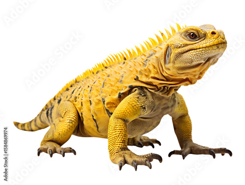 © techgiants, Obraz premium Vibrant yellow iguana with striped black patterns sitting calmly isolated on transparent background