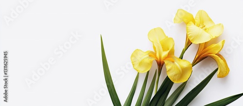 © Rasim, Fototapeta premium Vibrant yellow iris flowers on the left with lush green leaves against a clean white background creating a fresh and elegant composition