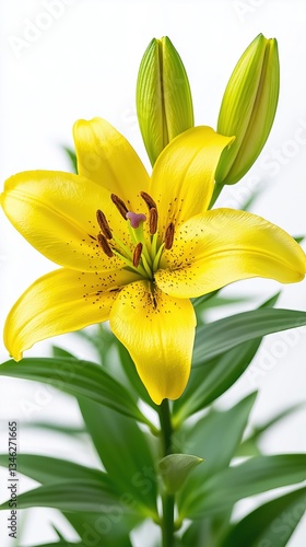 © Byca, Fototapeta premium Vibrant yellow lily bloom with buds against a white background