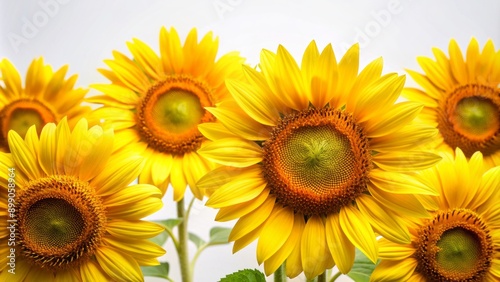 © DigitalArt Max, Fototapeta premium Vibrant yellow petals surround intricate, dark centers of freshly bloomed sunflowers, standing upright against a crisp, clean white background.