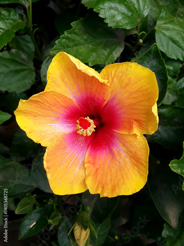 Naklejka premium Vibrant Yellow Pink Hibiscus Flower in Full Bloom