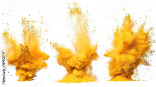 © Julia Jones, Fototapeta premium Vibrant Yellow Powder Explosions Isolated on White Background