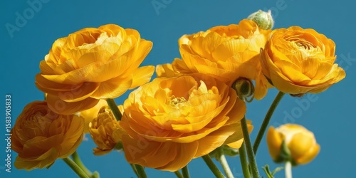 © Oleg Frolov, Naklejka premium Vibrant Yellow Ranunculus Flowers Against Clear Blue Sky