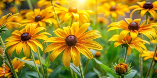 © Sirinporn, Fototapeta premium Vibrant yellow rudbeckia flowers bloom amidst lush green leaves, creating a beautiful, soft focus background with warm natural light and gentle texture.