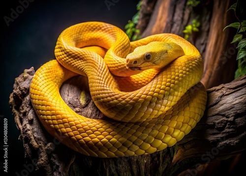 © Four888, Fototapeta premium Vibrant Yellow Snake Coiled on Tree Trunk - Low Light Night Photography