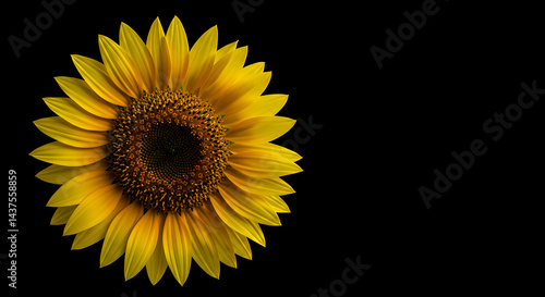 © Miftakhul, Fototapeta premium Vibrant yellow sunflower close-up on black background, isolated studio shot ideal for websites, blogs, and nature-themed designs