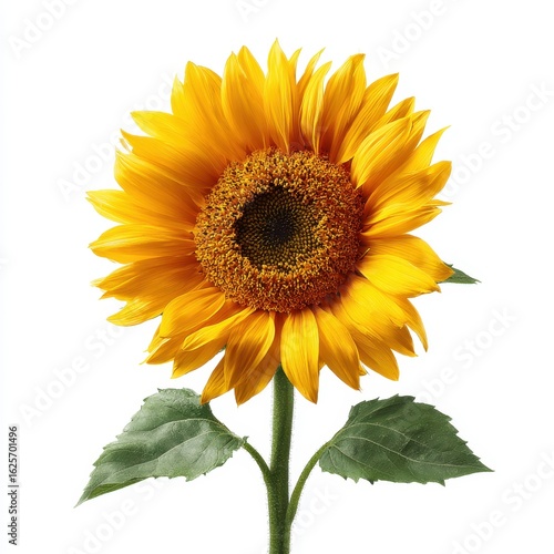 © BiangStocker, Obraz premium Vibrant yellow sunflower, green leaves, and stem on white background