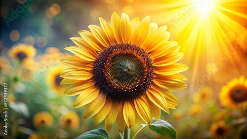 © DigitalArt Max, Fototapeta premium Vibrant yellow sunflower with bright petals and dark center isolated on a blurred natural background perfect for summer designs.