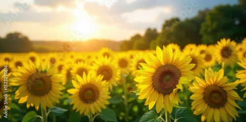 Fototapeta premium Vibrant yellow sunflowers in a field bathed in golden sunlight, creating a stunning natural landscape A perfect image for summer, nature, and happiness themes , field, sky, leaves