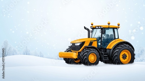 Naklejka premium Vibrant Yellow Tractor on Snowy Landscape Under Soft Winter Light with...