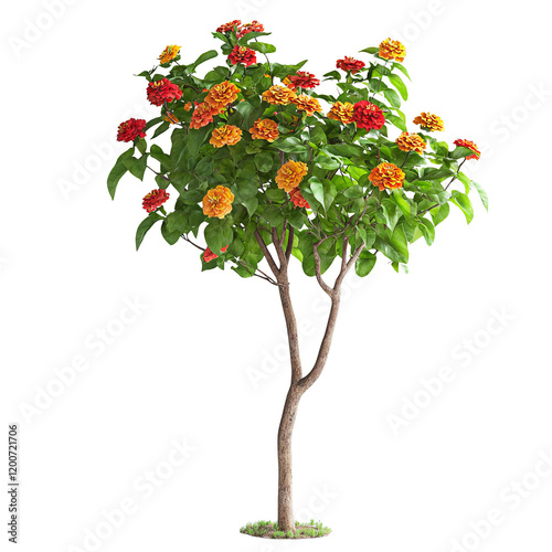 Fototapeta premium Vibrant Zinnia Flowers on Tree with Green Leaves and Bright Colors