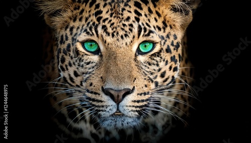 © netsay, Obraz premium VibrantEyed Black Panther Strikingly Framed against a Dark Backdrop Elegant Leopard with Luminous Green Eyes Captivating Viewers in Stunning Portrait Photography