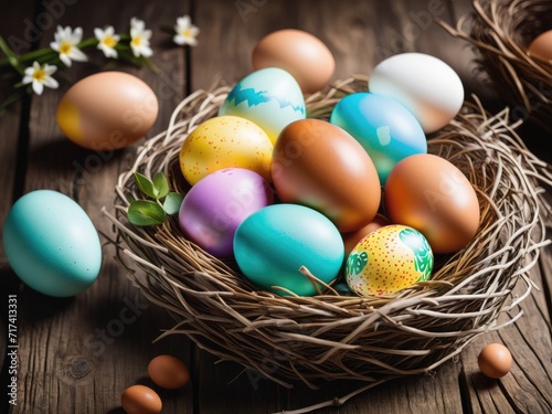 Fototapeta premium Vibrantly colored Easter eggs nestled inside a nest placed on a wooden table...