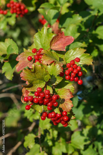 © Vitalii M, Obraz premium Viburnum branches with berries and autumn yellow leaves.