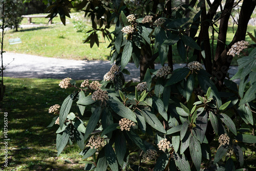 © Federico Magonio, Fototapeta premium Viburnum rhytidophyllum, the leatherleaf viburnum, is a species of flowering plant in the family Viburnaceae. It is native to Asia..Springtime blooming.