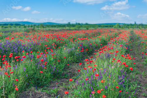© sun_house_ann, Fototapeta premium Vicia cracca. mouse peas and poppy seeds in a field in even rows