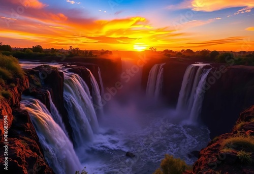 © DITSARAPHAN, Fototapeta premium Victoria Falls sunset, Zambia; fiery orange light bathes the cascading water, nature, wonder