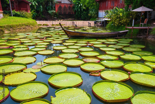 © samael334, Fototapeta premium Victoria water lily giant pads on pond with traditional Thai wooden boat at Phuket, Thailand. Lake with floating green leaves of waterlily and boat. Tourism and travel landmark in Asia