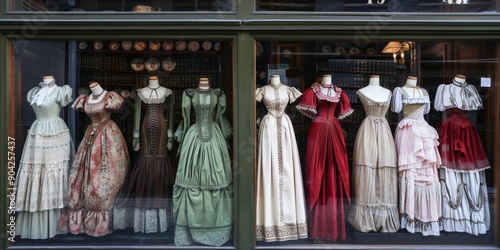 © kwanchaift, Naklejka premium Victorian era dresses on display in an antique shop window, showcasing fashion history