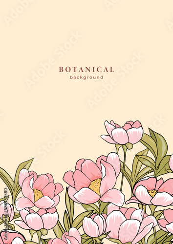 © Morena, Naklejka premium Victorian style vintage template with pink blooming peony flowers. Floral pattern. Frame design with botanical elements for cover, poster, placard, flyer