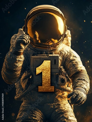 © Thanhtung, Fototapeta premium Victorious Astronaut Celebrating with Golden Number One