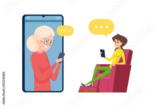 © ONYXprj, Fototapeta premium Video call to parents. Daughter and mother talking phone. Happy grandmother and granddaughter, elderly woman with smartphone vector illustration. Grandmother use smartphone, woman and granddaughter