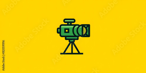 Fototapeta premium Video camera icon vector illustration with simple line art design in green and yellow tones on solid background, representing digital media, recording technology, and creative minimal logo concept
