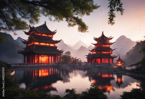 © wafi, Naklejka premium video cartoon fantasy artwork background style game scenes digital chinese