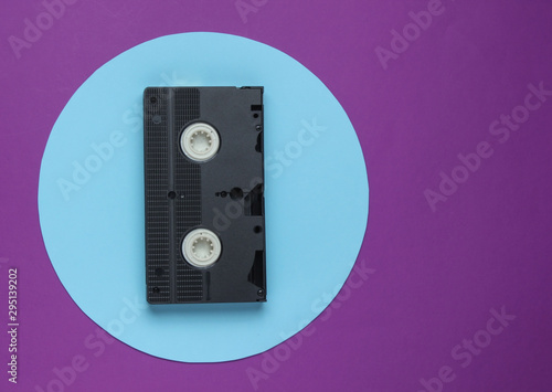 © splitov27, Fototapeta premium Video cassette on purple background with blue pastel circle. Minimalistic retro concept. 80s. Top view