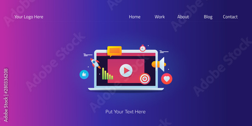 Obraz premium Video player displaying on laptop screen, digital marketing concept with icons and text, web banner template, vector illustration.