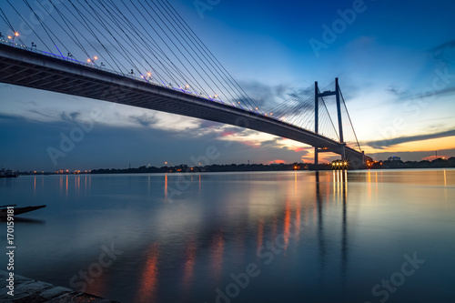 Obraz premium Vidyasagar Setu - the cable stayed bridge on river Hooghly at sunset.
