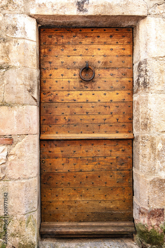 Fototapeta premium Vieille porte médiévale en bois dans un mur de pierre