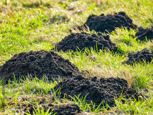 © focus finder, Fototapeta premium Viele Wühlmaus Haufen auf einer Wiese