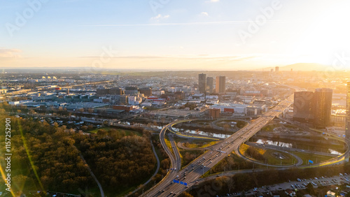 © Владимир Смирнов, Fototapeta premium Vienna, Austria Aerial View: Sunset Over City Center and Canal. Top cinematic aerial view.