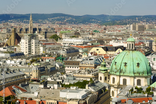 © Victoria, Naklejka premium Vienna, Austria, September 09,2018: Aerial view of Vienna with tower of the town hall building, votivkirche and peterskirche churches from the stephansdom cathedral.