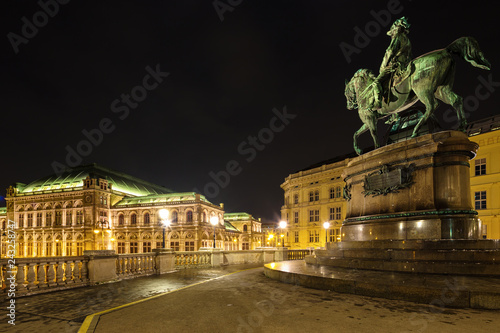 Naklejka premium Vienna State Opera at night and equestrian statue of Archduke Albrecht, Duke of Teschen, Vienna, Austria