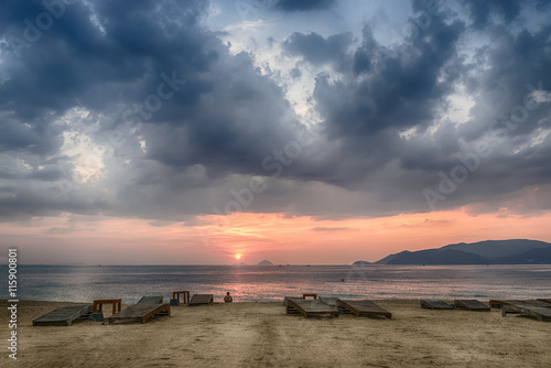 Naklejka premium Vietnam, Nha Trang, Sandy beach, empty sunbeds, the calm sea, the sunrise, a...