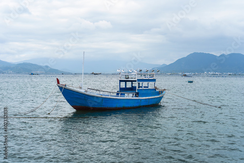 Naklejka premium Vietnamese blue boat swimming in south china sea in vietnam
