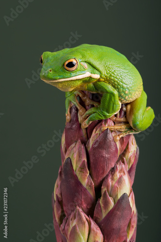© davemhuntphoto, Fototapeta premium Vietnamese Cave Gecko (Goniurosaurus araneus)/Vietnamese Cave Gecko climbing down a tropical flower