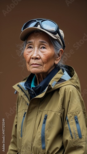 © Arceli, Fototapeta premium Vietnamese female elderly wearing functional outdoorwear on a mud brown background