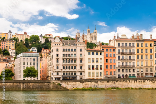 Fototapeta premium Vieux-Lyon, colorful houses in the center, on the river Saone, with the Fourviere cathedral in background