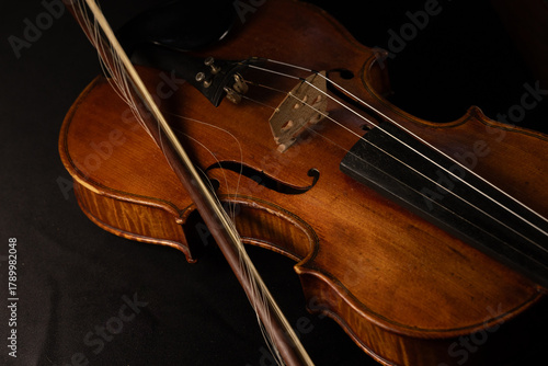 © Tof - Photographie, Fototapeta premium vieux violon posé sur un bel étui ancien de couleur bleu vert.